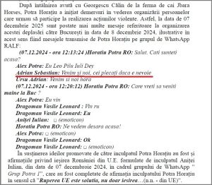 - în schimb, postarea de la pag. 20 , datată 27 noiembrie, este urmată de o consemnare total diferită a aceluiași procuror, Marius Iacob: „Inculpatul Horațiu Potra și-a exprimat acordul ferm și neechivoc, manifestînd… astfel o atitudine de susținere explicită față de ideea unei reacții sociale radicale în cazul anulării scrutinului electoral. Această exprimare denotă nu doar asumarea unei poziții clare în raport cu o eventuală reație publică de amploare, ci și o încurajare implicită a unui climat de instabilitate, aspect relevat în analiza conduitei inculpatului”!